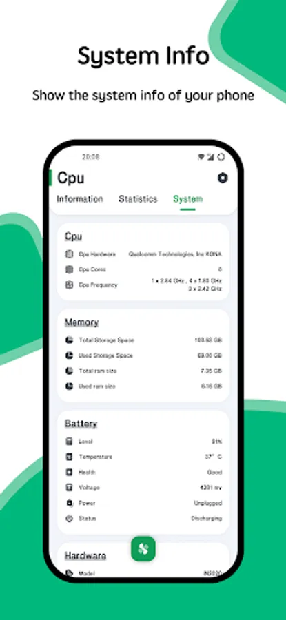 Show the detailed device information, including: cpu information, system information, hardware information, screen information .