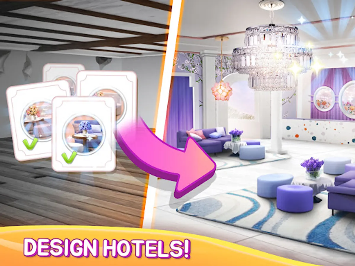 ● DECORATE dozens of hotel locations throughout the world. Pick out every piece of design detail - from vinyl wood flooring & marble walls to colorful accents and bedding.