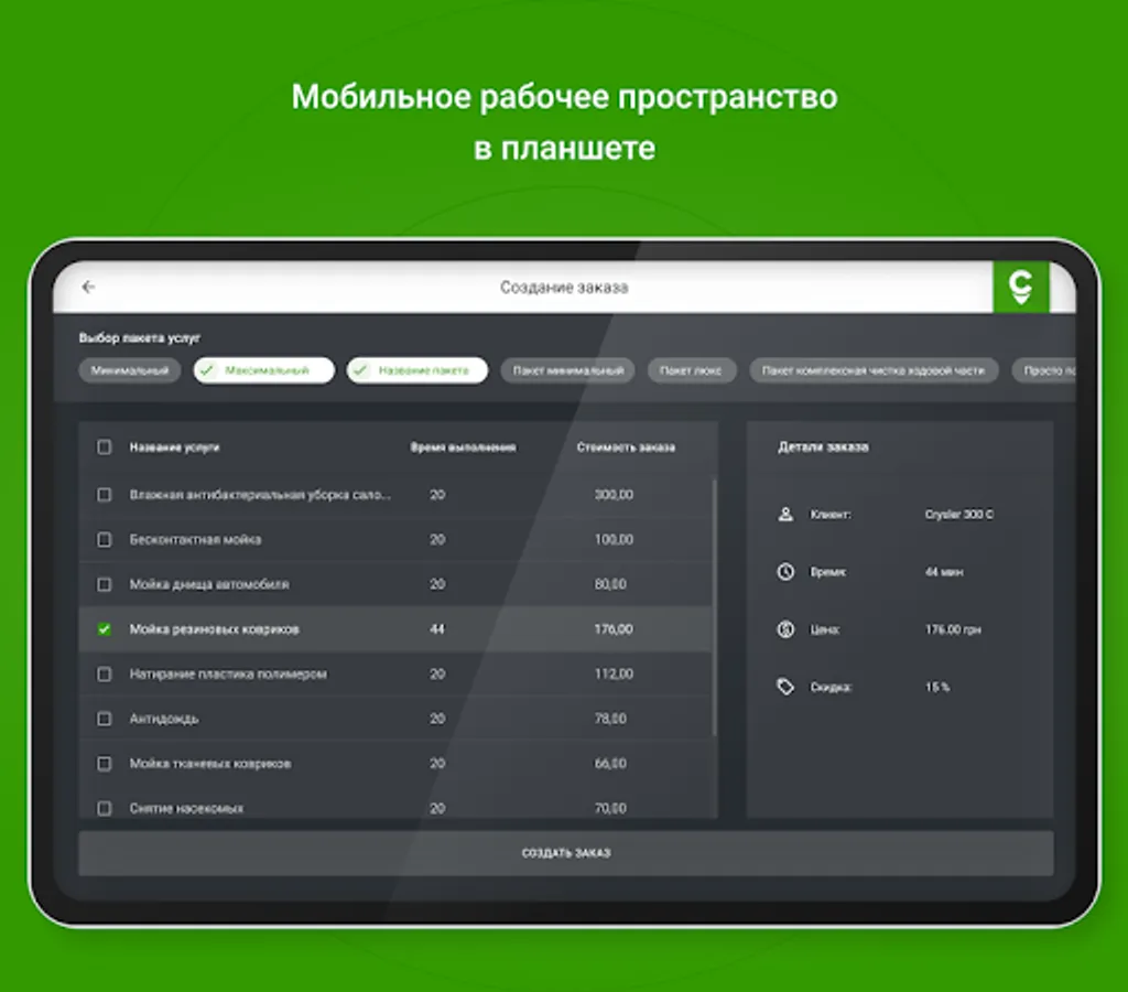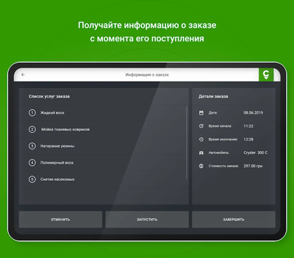 - see all the information entered in the car profile when ordering a service for this car. Prepare the necessary materials and equipment in order to start the execution of the order immediately upon arrival of the client (for the contractor / specialist / master)