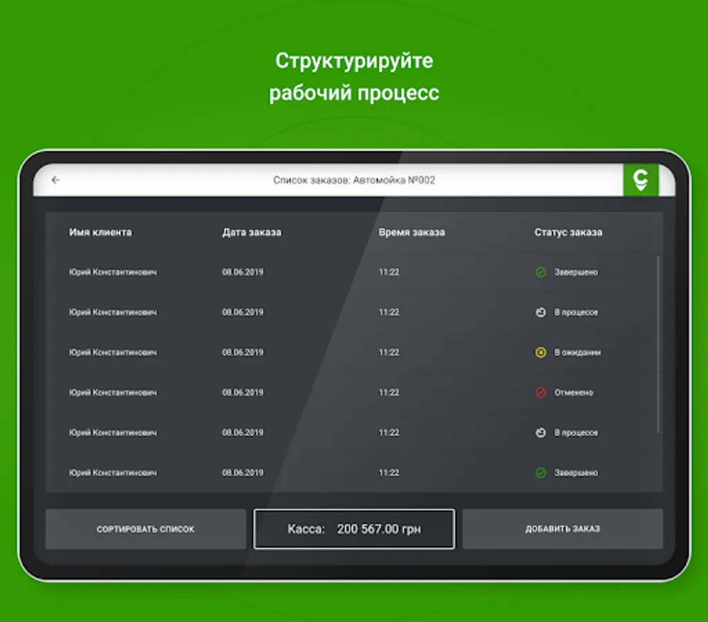 - for the owner / manager of the company: service automation, accounting of data (orders, revenue, customers, employee performance) in real time.