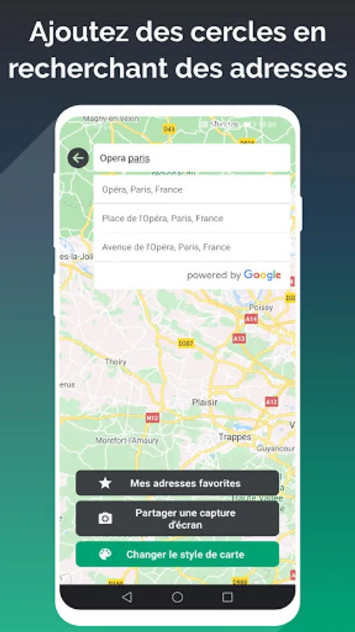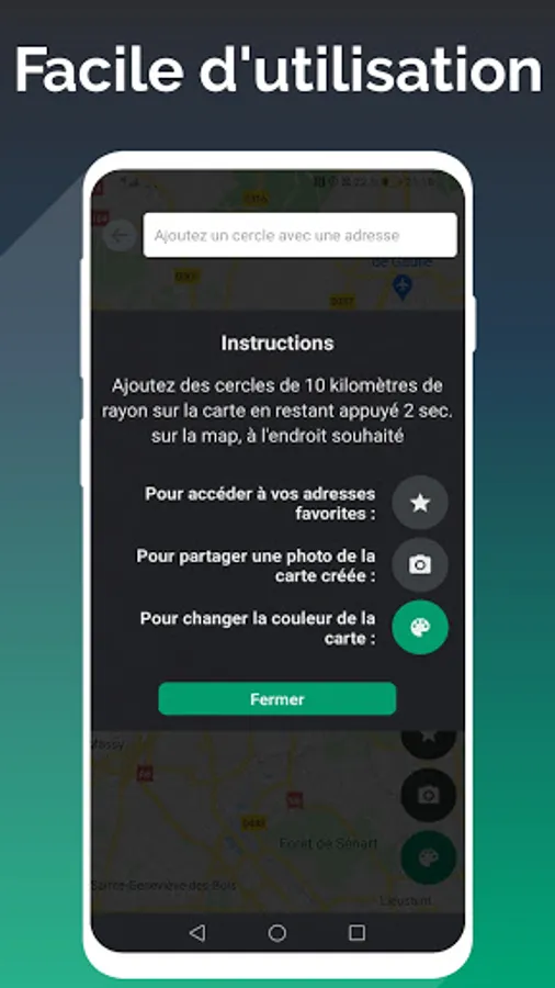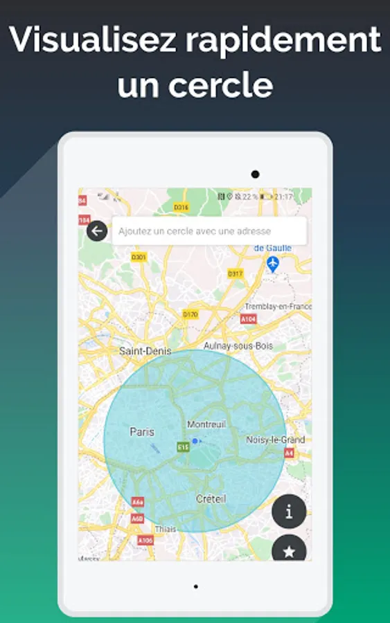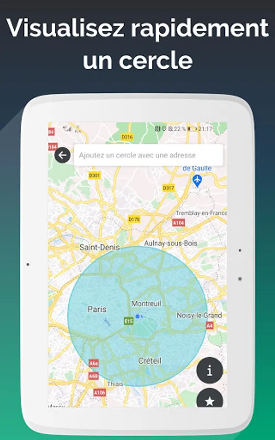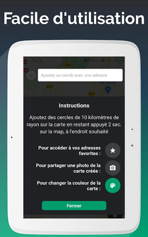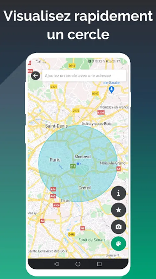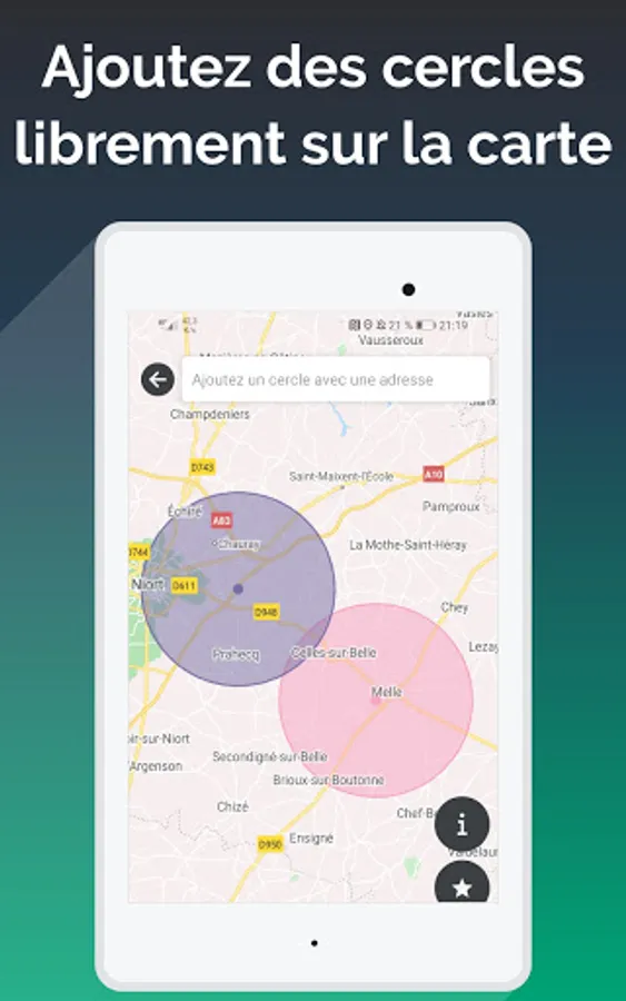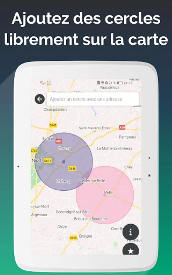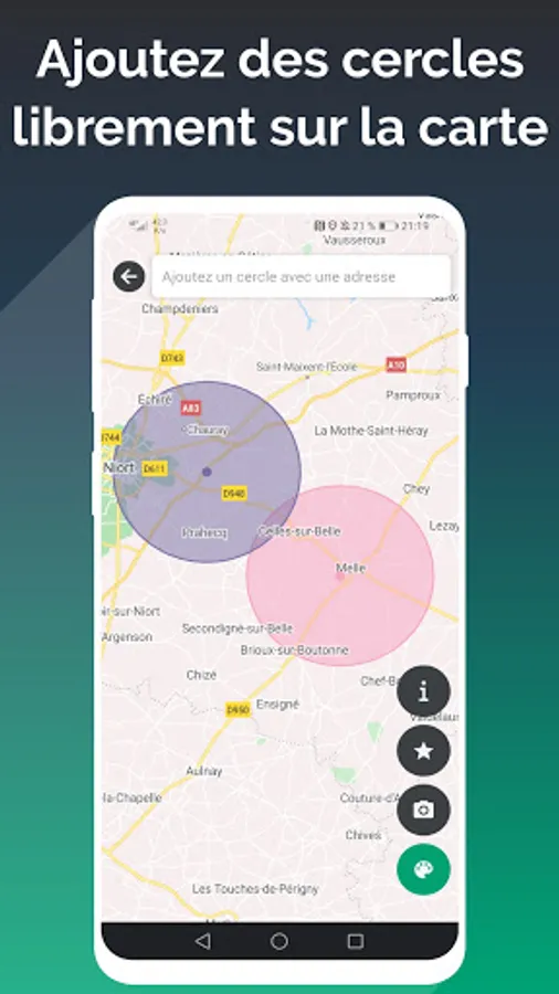This application will allow you very easily and quickly to place circles of different radius to show you at a glance the distances. Allows you to calculate the distance from one point to another.