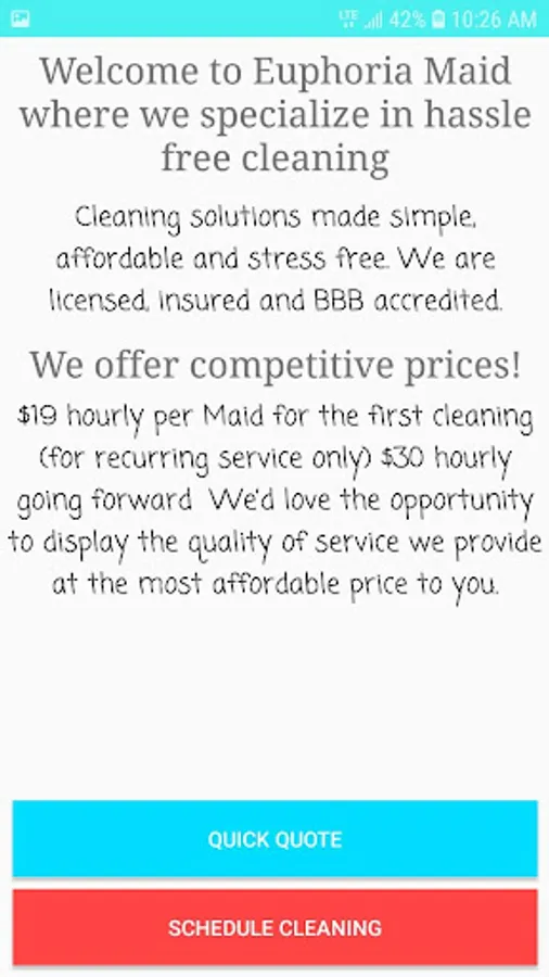 We offer hassle-free cleaning solutions made simple, affordable, and stress-free. Our pricing is competitive with rates such as $19 hourly per Maid for the first cleaning (for recurring service only) $30 hourly going forward. We’d love the opportunity to display the quality of service we provide at the most affordable price to you.