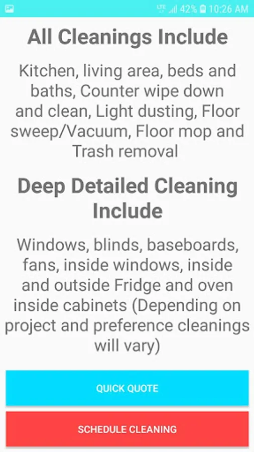 All cleanings include kitchen, living area, beds, and baths, counter wipe down and clean, light dusting, floor sweep/vacuum, floor mop, and trash removal.