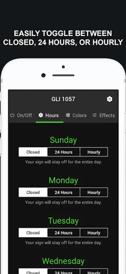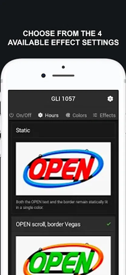 Download this companion app to update and control your Bluetooth-enabled GLI OPEN sign (1050B and 1057B models). Easily connect to your sign to update any or all of the following: on / off times, business hours, animation settings, colors, and display type. No setup required.
