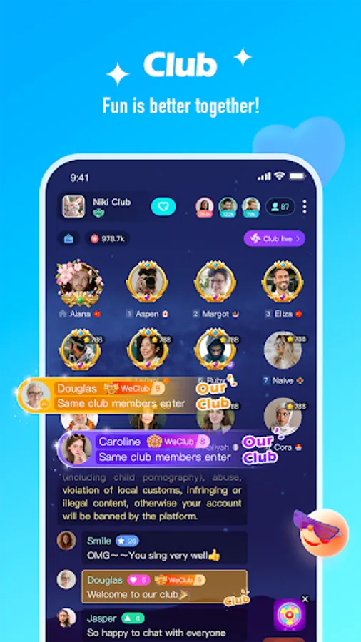 Niki Live offers you a high-quality community where you can chat with up to 8 friends in real-time in party rooms and watch the best live streams. We monitor chat environments in real-time to ensure everyone can enjoy a safe and friendly social experience.