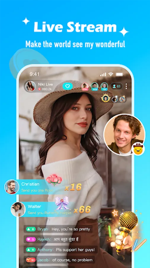 Niki Live offers you the ability to search for friends globally, allowing you to make new friends from different countries with similar interests. We also provide a global friend-making competition to make your entertainment experience more colorful!