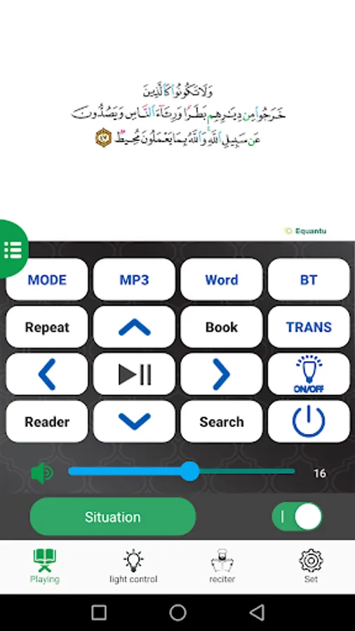 This APP connects the device terminal through Bluetooth BLE, sends instructions through APP to control the device terminal, such as on and off the LED, allowing the device to enter different working modes, App will Display Quran synchronize with Equantu Quran speaker, Can seach any surah and Ayat for Equantu quran speaker,and timing switch, etc.