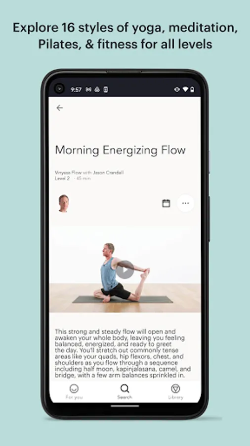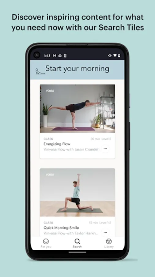 Head to Search to find a class for how you feel in the moment—whether you need stress-reducing breathwork, a calming meditation, an energizing yoga flow, or a sweat-inducing cardio workout. You can search by keyword and use the filters to narrow your results by practice, duration, teacher, level, body part, and more.