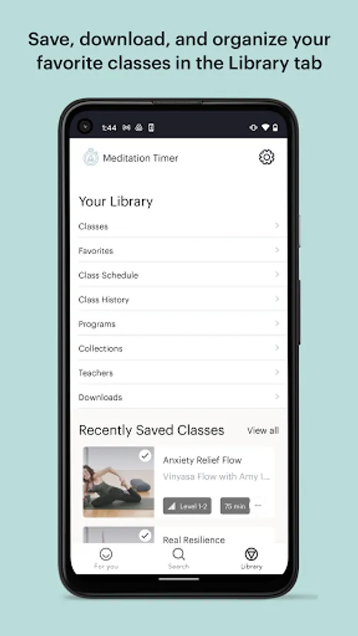 Your Library contains all your practice essentials. Find your saved, favorite, and scheduled classes; collections you’ve saved or created; programs you’ve joined; and teachers you follow — all in one place.