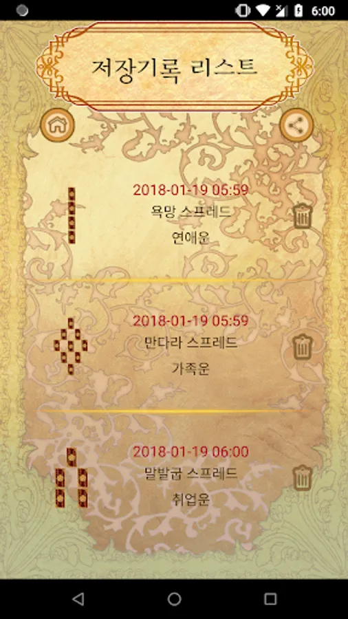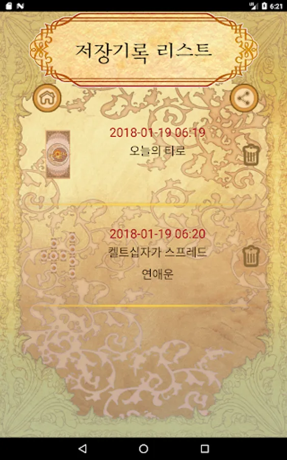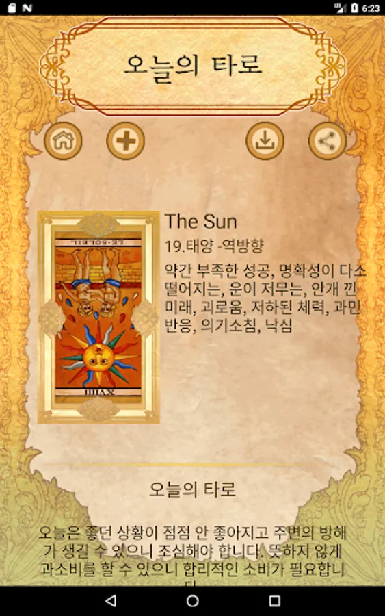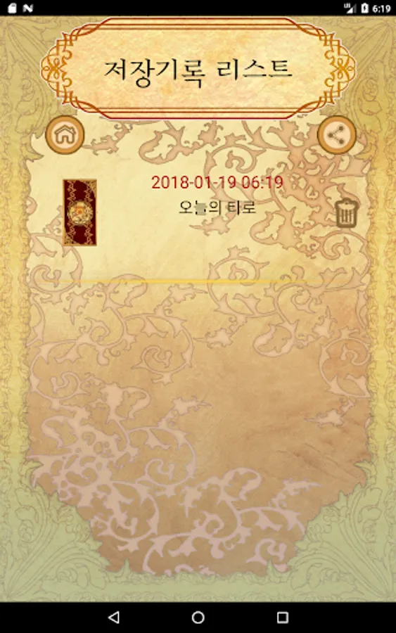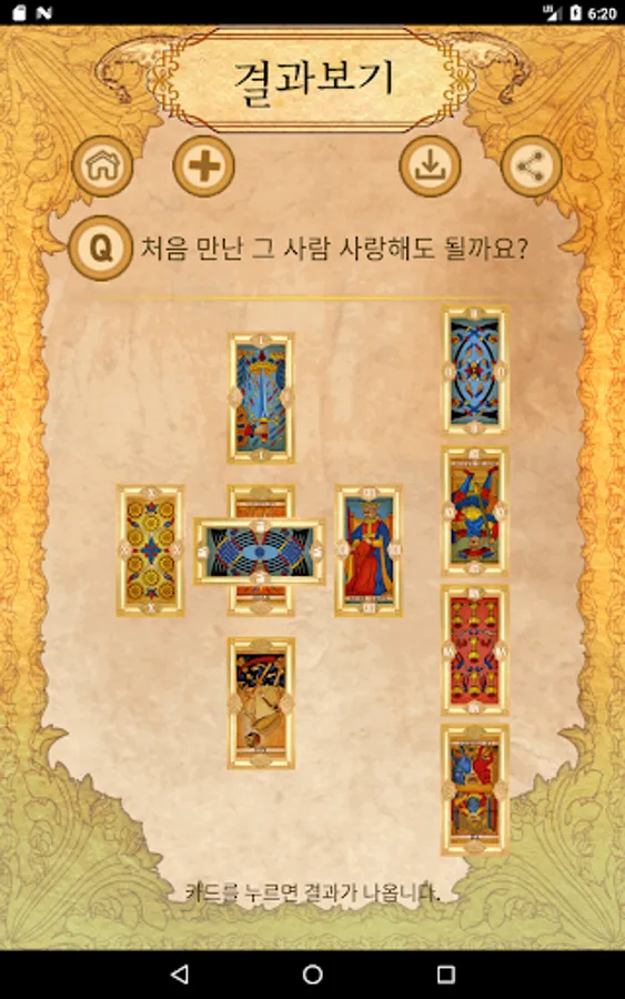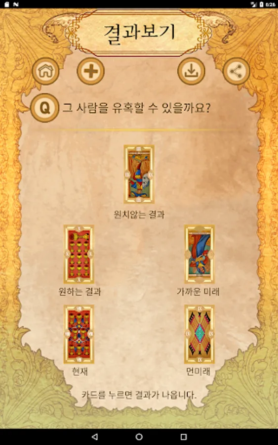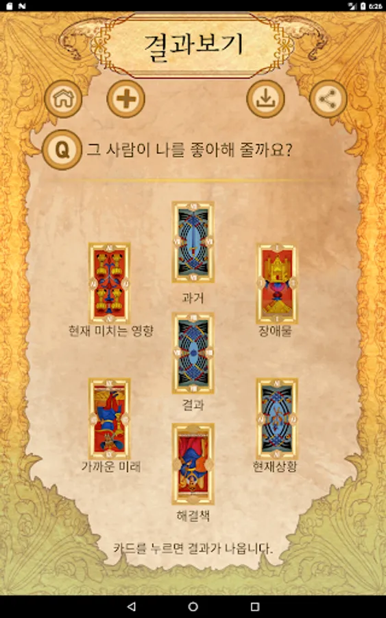 If you press the share button on the top right after viewing the tarot store, you can share the contents of the tarot store to KakaoTalk and Kakao Story.