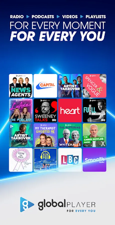 In addition, Global Player offers live playlists that cover music for every mood. From editor's picks to artist takeovers, the biggest hits to that perfect playlist for focus and relaxation, we've got it all covered. Global Player also features video content from all of Global's brands. The Global Player app gives you access to all your favourite UK radio stations, including Heart Radio, Capital, Smooth Radio, LBC Radio, Radio X, Classic FM, Capital XTRA, Capital Dance, and Gold Radio. You can customise your listening experience and enjoy personalised recommendations for podcasts and playlists on your commute, catch up on missed shows, and discover new content. With podcasts, video content and live playlists, the app is your one-stop destination to stream entertainment.