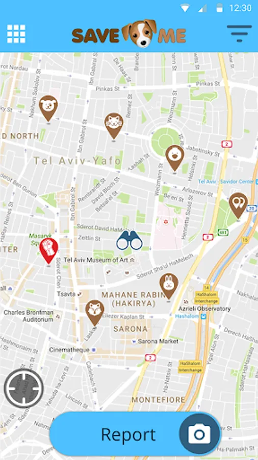 Whenever the application is started, you will be shown a map with your location and the bubbles (notices, reports) of animals in distress that have been posted by other users.
