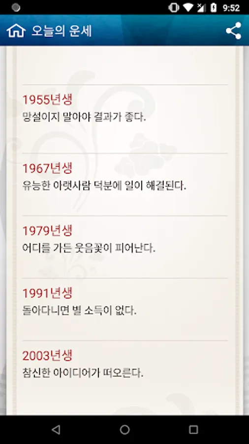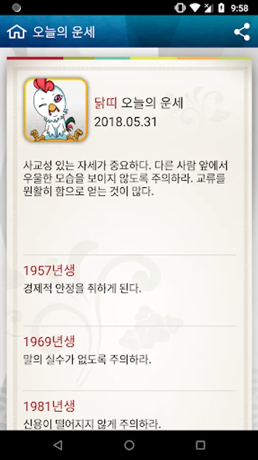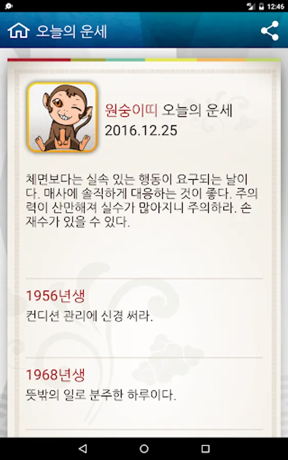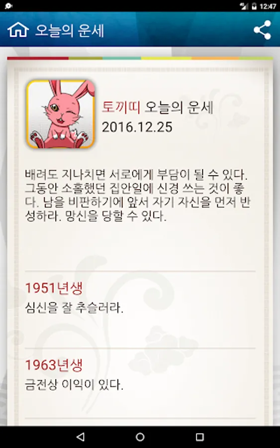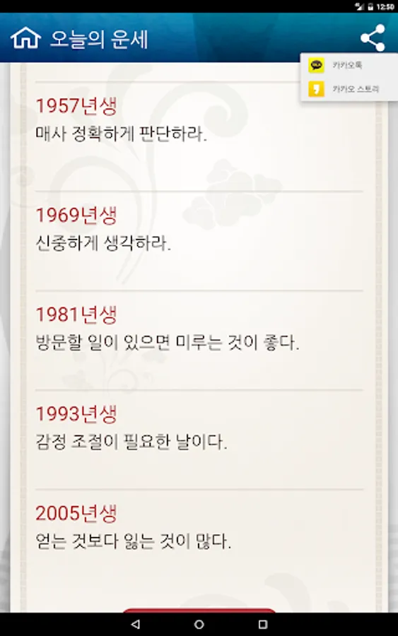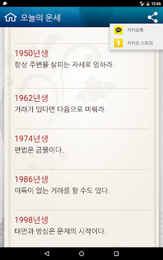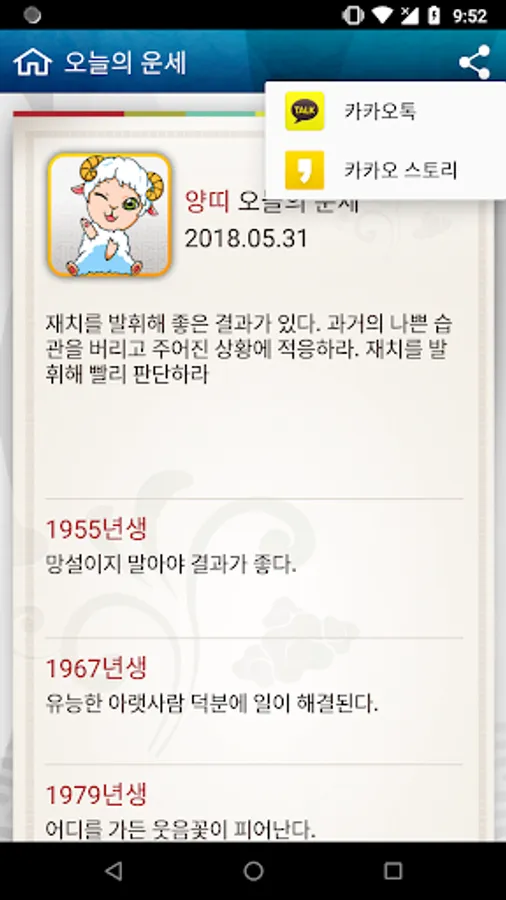 When you see the fortune-telling fortune (fortune of the day) and the lottery prospect number drawing and press the share button on the upper right, you can share it with Kakao Talk and Cacao story.