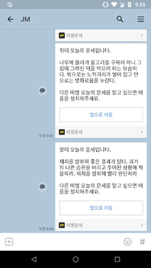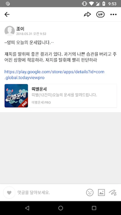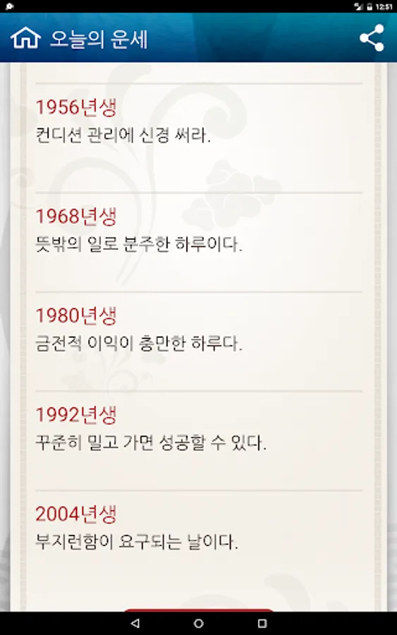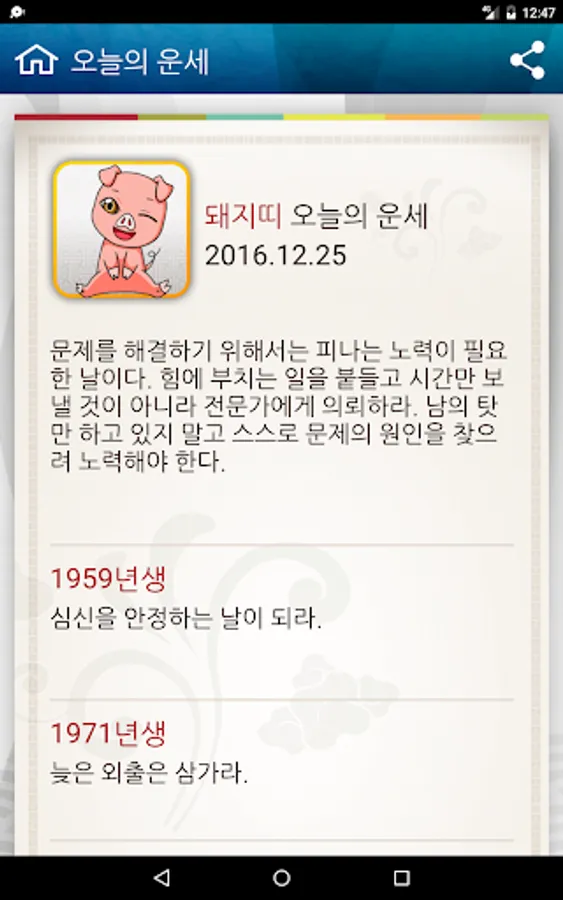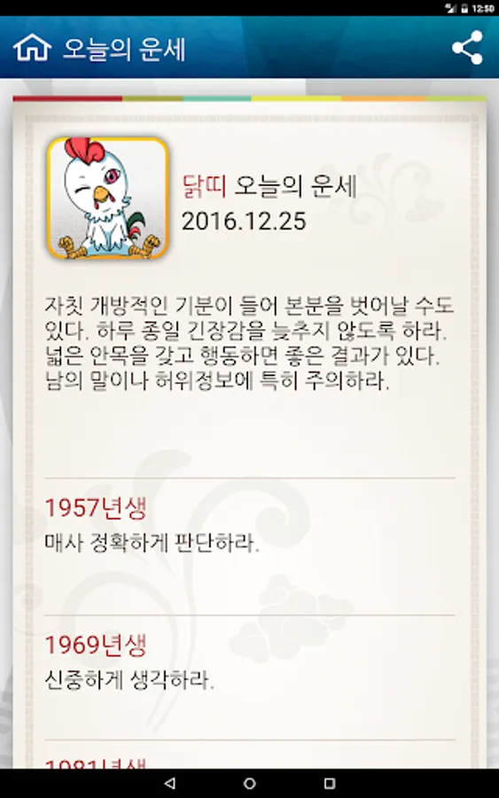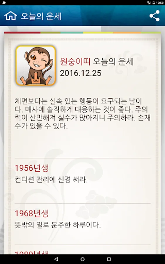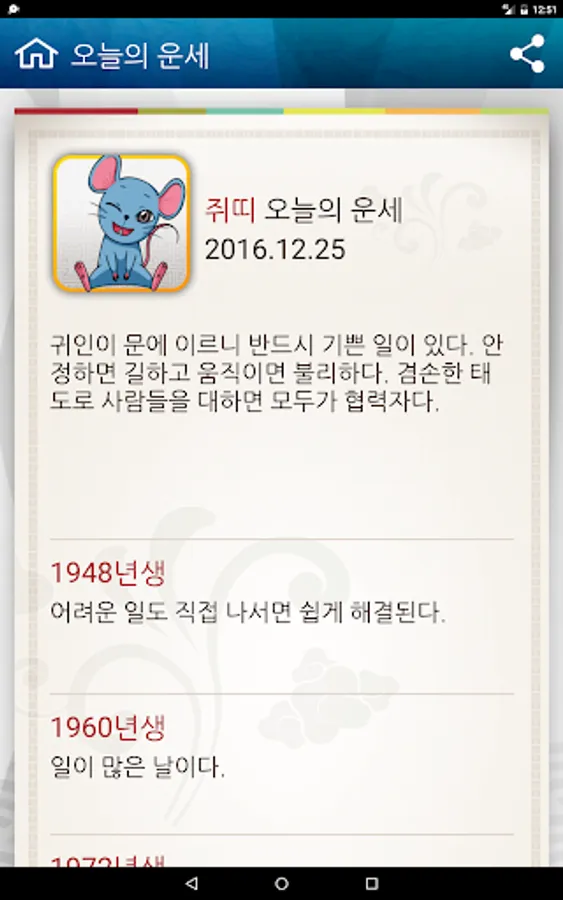When you see the fortune-telling fortune (fortune of the day) and the lottery prospect number drawing and press the share button on the upper right, you can share it with Kakao Talk and Cacao story.