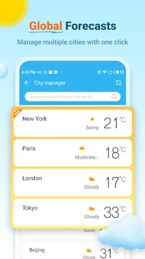 - Global. You can see weather in any places you like, ex: New York weather, Paris weather, London weather, Tokyo weather