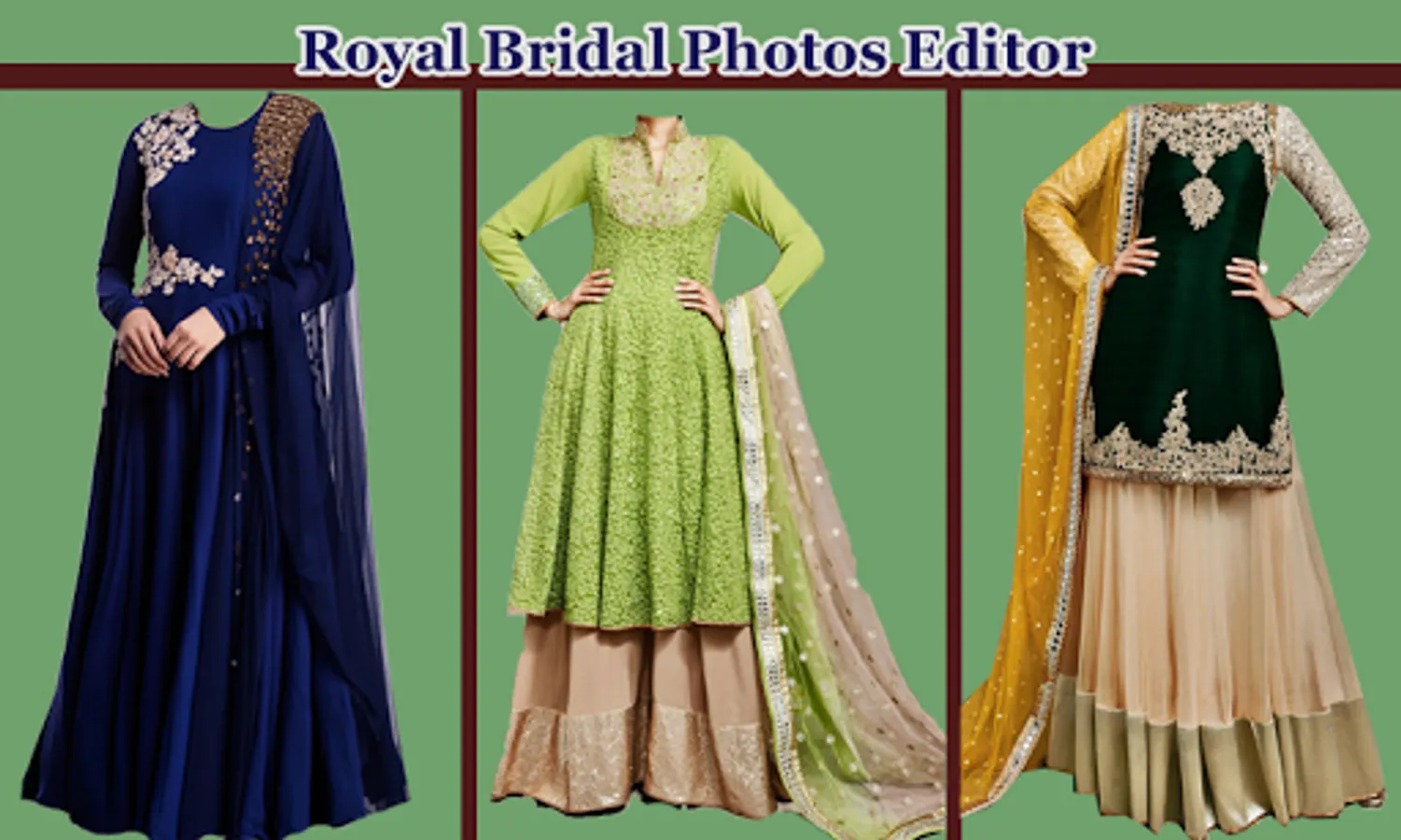 Bridal photo editor fashion is the best top Indian bridal fashions & other countries suits app having suites for bridal for her wedding parties. You can make their wedding photo, women Suit Photo, Marriage Photo and Dulhan Dress photo. App for the Bridal, the bride groom(comming soon) photo series is wedding dress designs and international women suits. Bridal suite photo editor amazing app lets you see yourself in the best collection of Bridal suites for free.