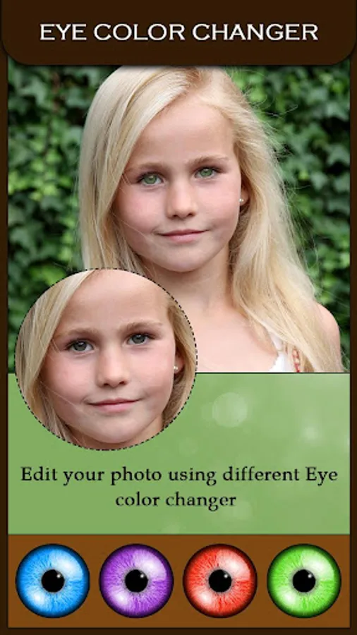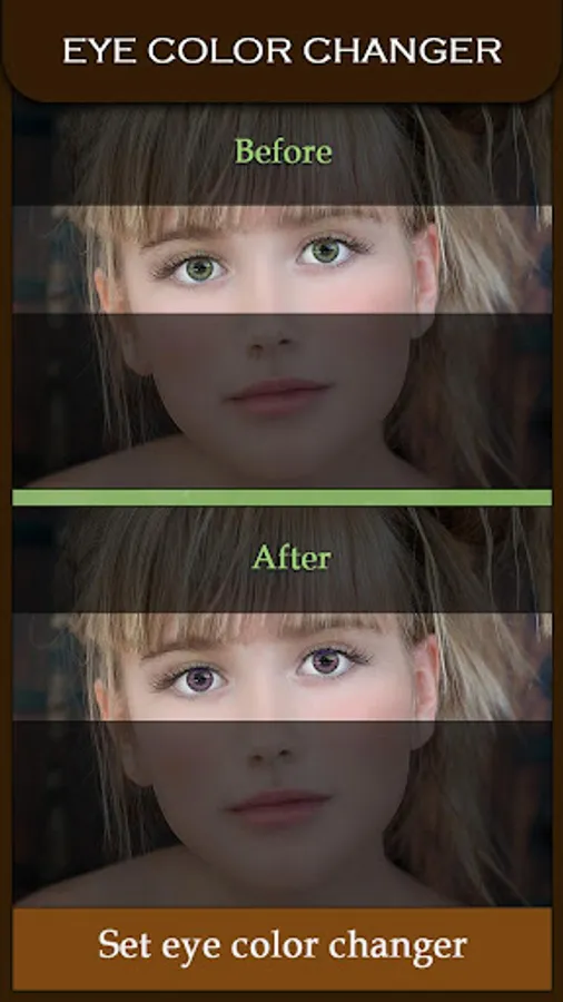 Eye Color Changer - Eye Lens Photo Editor lets you to change the color of your eyes lens! Using a unique blending technique creates an effect that looks very natural on the eyes. It works equally well for both dark and light colored eyes.