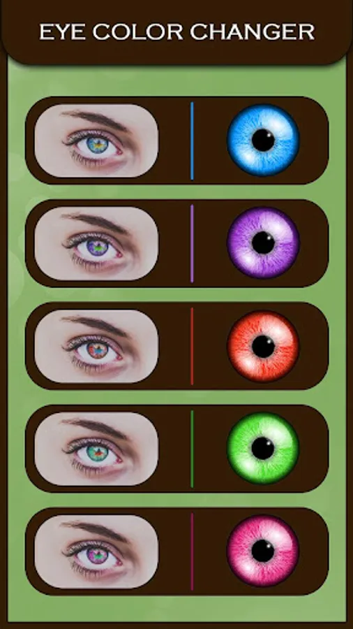 Its very simple simulation app for changing eye color of your choice. you can pick your favorite color or lens among very big list of eye lenses.