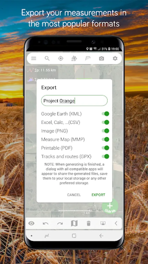 * Working format: Measure Map, KMZ, KML, CSV ,GPX, Image (PNG) and PDF