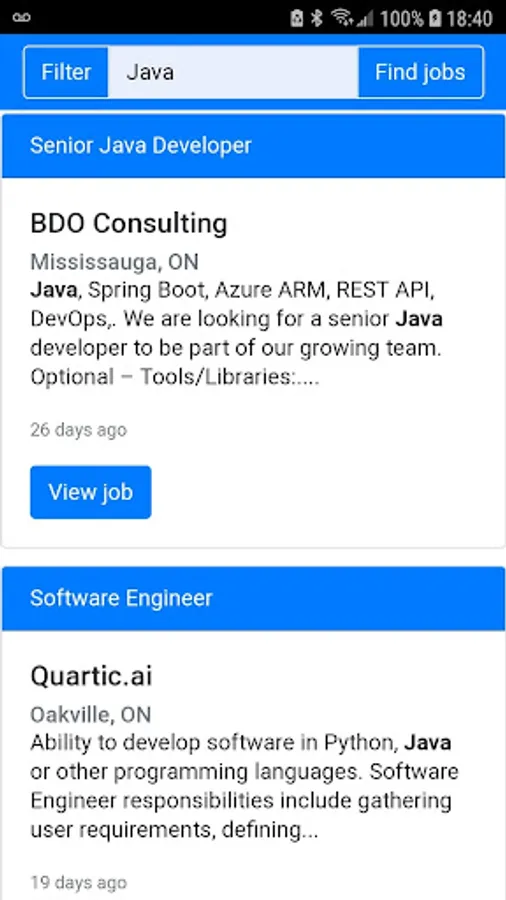 All jobs are grouped into one screen for fast and easy navigation. Expend every job listing for more details and apply for a job link (opens original indeed website).