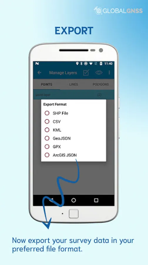 - Export GIS data file formats in CSV, KML, .SHP, GPX ,GeoJSON and ArcGIS JSON