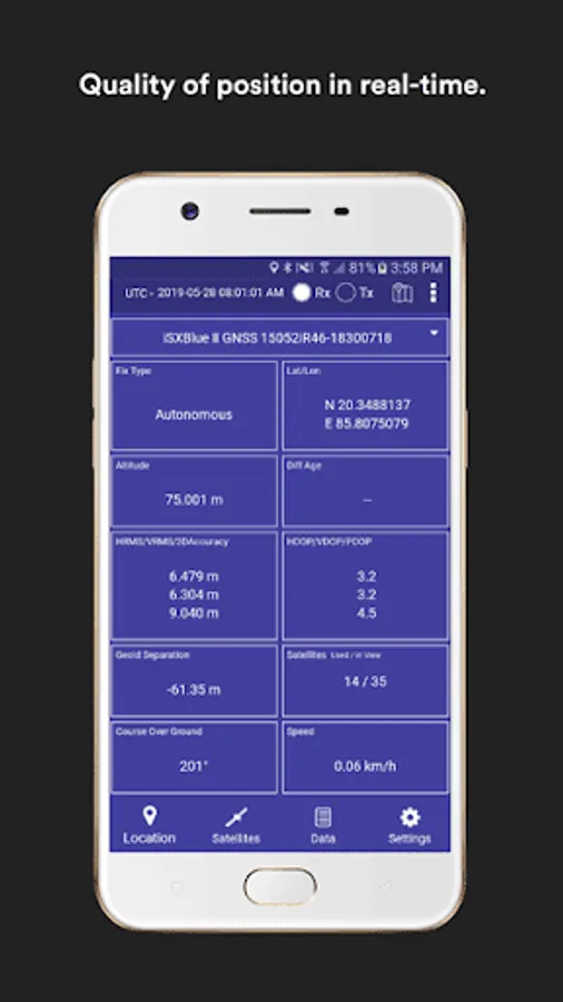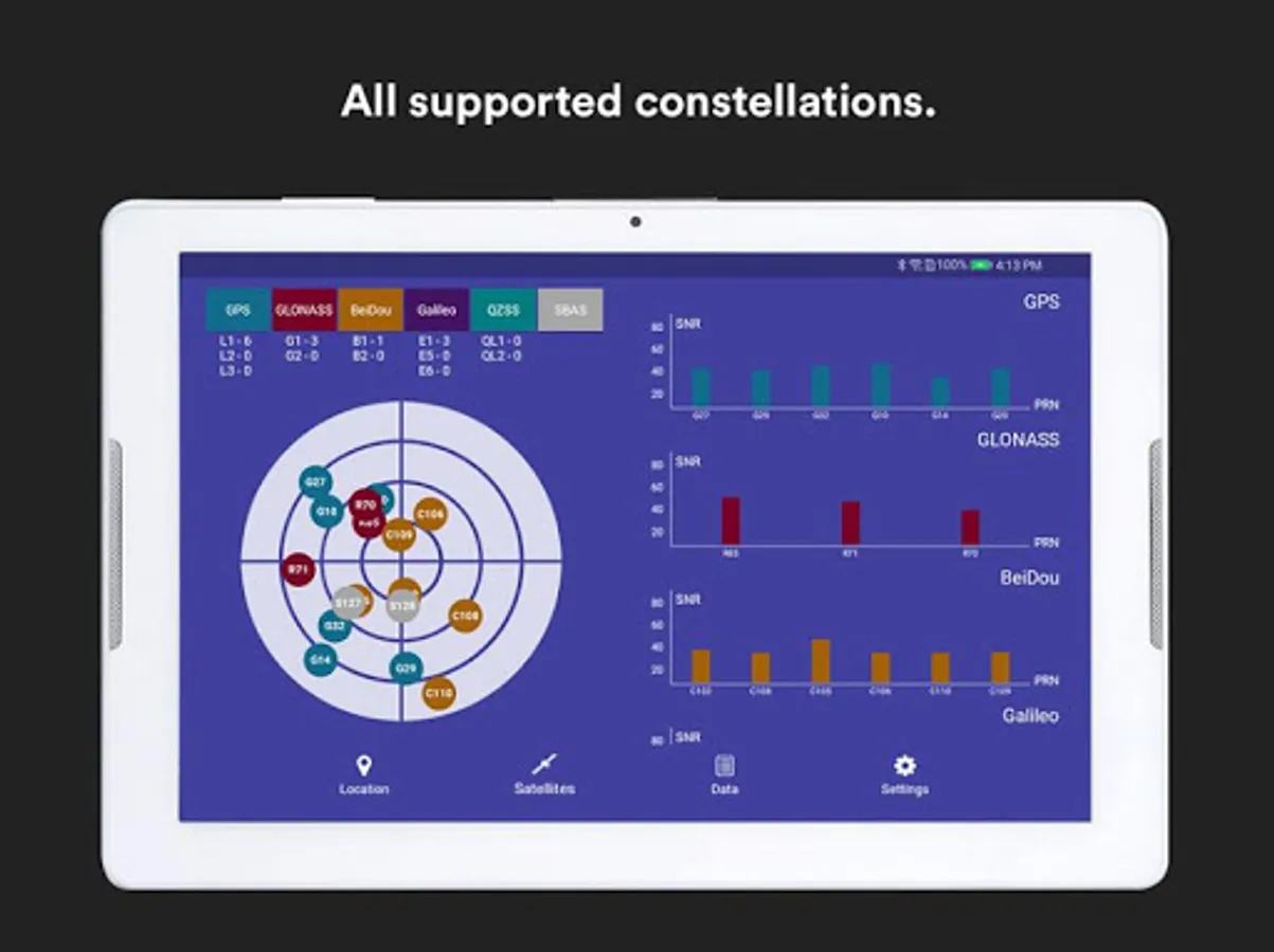 Easy to allow mock location on your android phone or tablet and use the position of the external receiver in any 3rd party application. Get GPS status data like position, height, accuracy, satellites, and speed in real time. View and analyse the position information provided by the GNSS receivers and metadata related to its location.