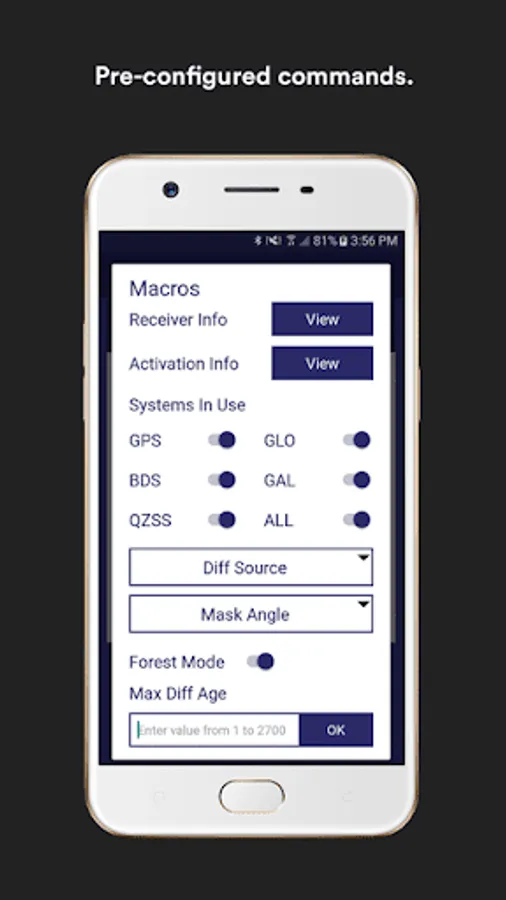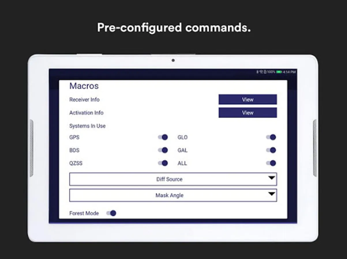 - Easy to use one touch previously configured commands to communicate directly with GNSS Bluetooth device.