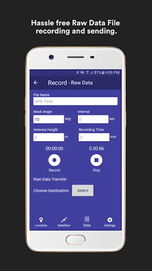 Record and transfer the raw data file allowing post-processing of information for surveying, such as: