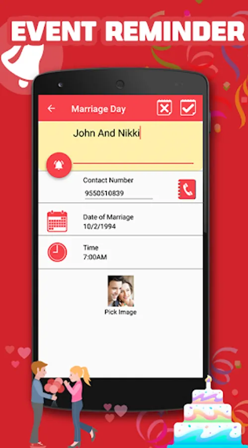 - Add to the reminders name, phone number, date of birth / marriage day with image and save it successfully