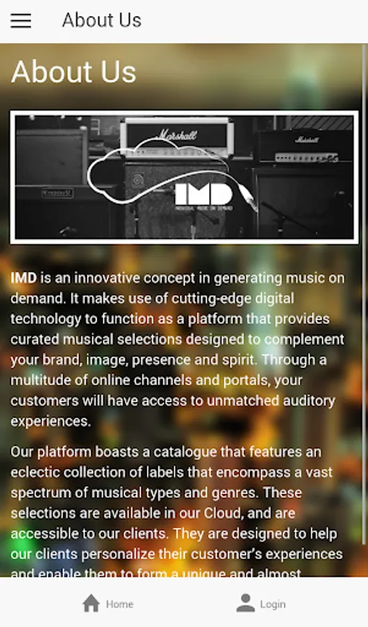 Now you can log in to IMD system and listen to your tracks from anywhere using your mobile. IMD is an innovative concept in generating music on demand. It makes use of cutting-edge digital technology to function as a platform that provides curated musical selections designed to complement your brand, image, presence and spirit. Through a multitude of online channels and portals, your customers will have access to unmatched auditory experiences.