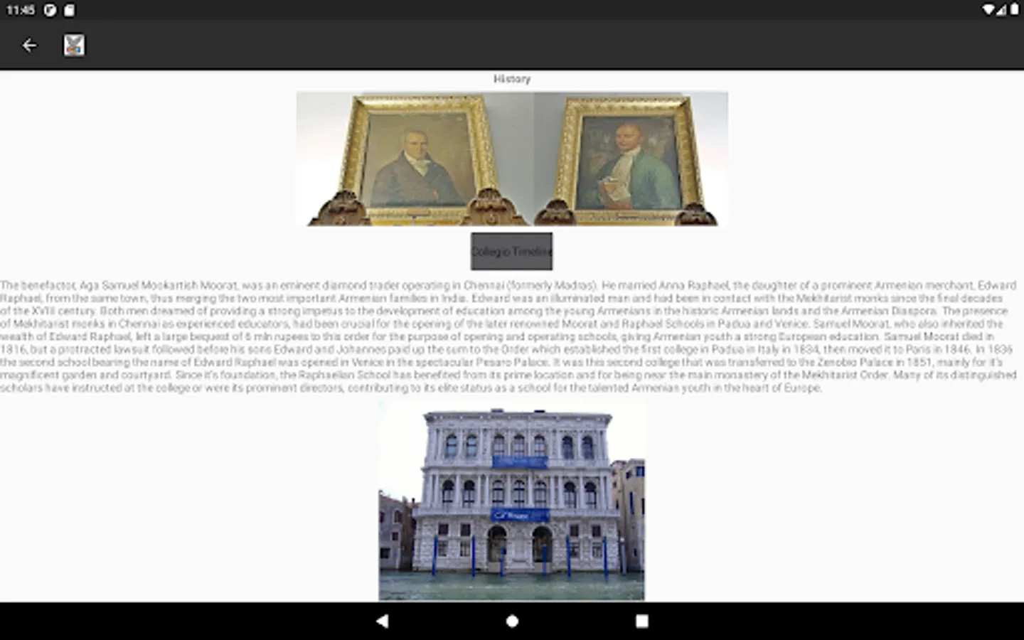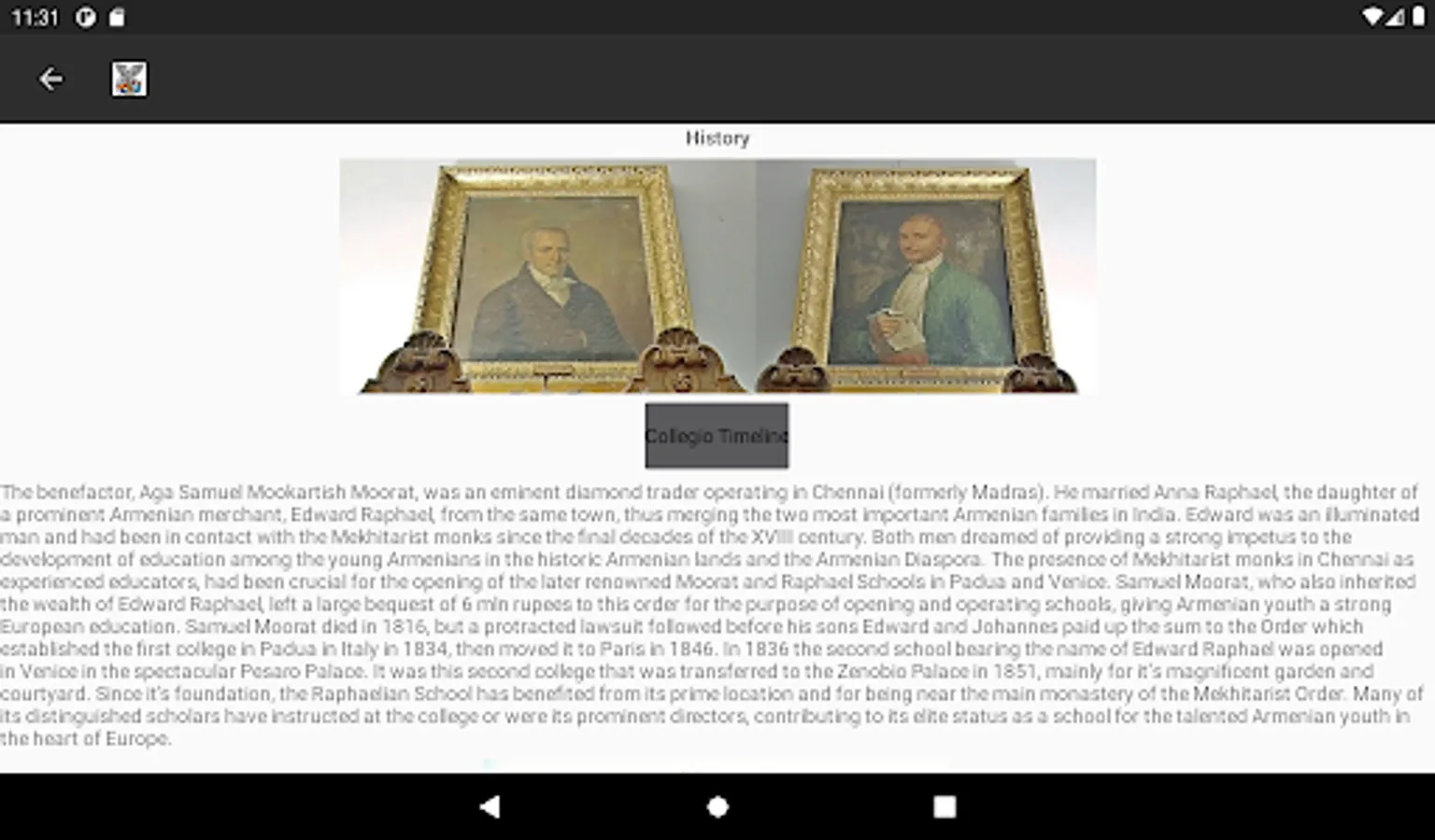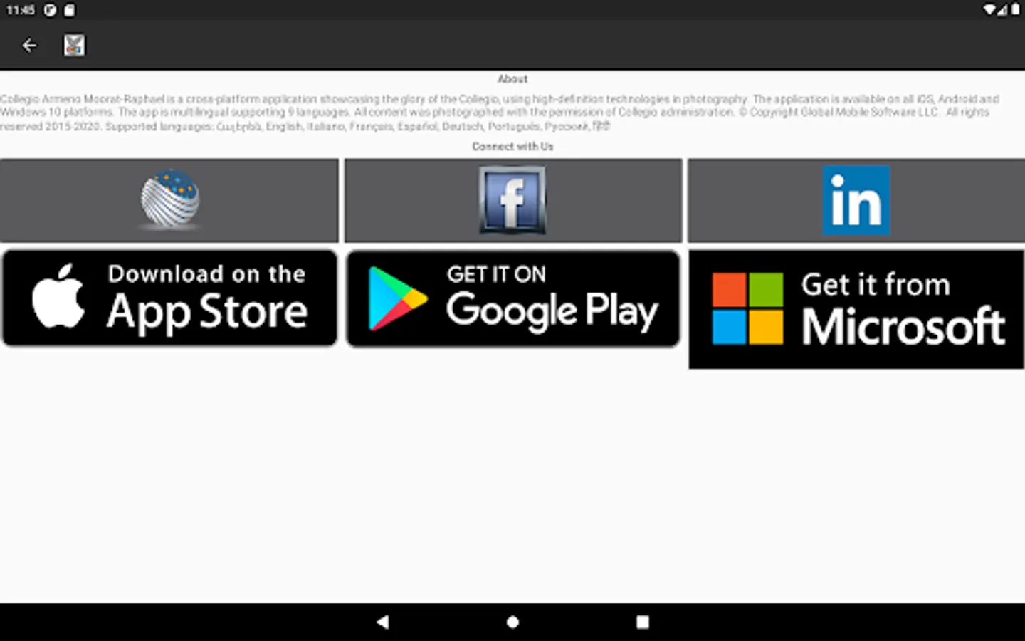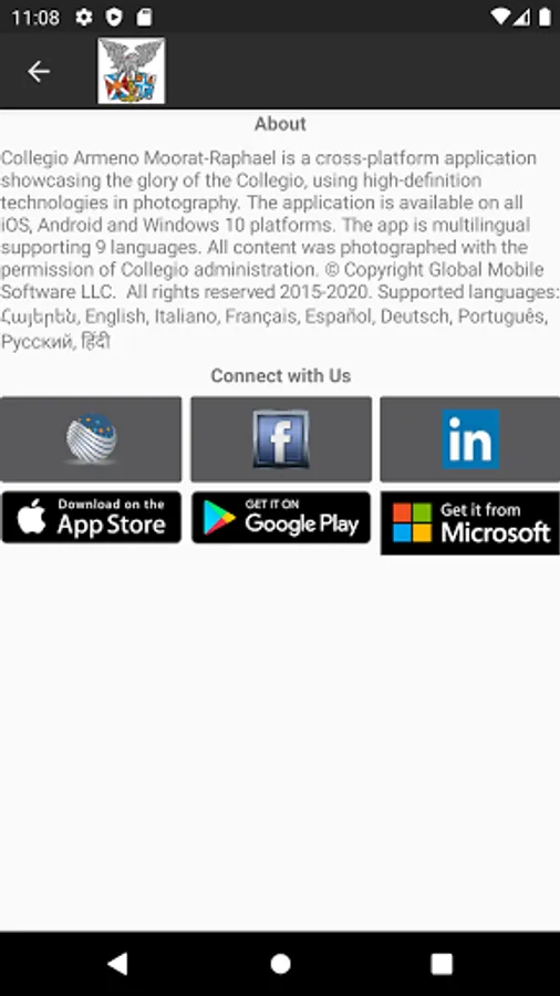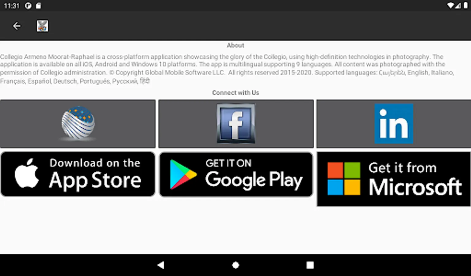 Collegio Armeno Moorat-Raphael is a cross-platform application showcasing the glory of the Collegio, using high-definition technologies in photography. The application is available on all iOS, Android and Windows 10 platforms. The app is multilingual supporting 9 languages. All content was photographed with the permission of Collegio administration. © Copyright Global Mobile Software LLC. All rights reserved 2015-2020. Supported languages: Հայերեն, English, Italiano, Français, Español, Deutsch, Português, Pусский, हिंदी