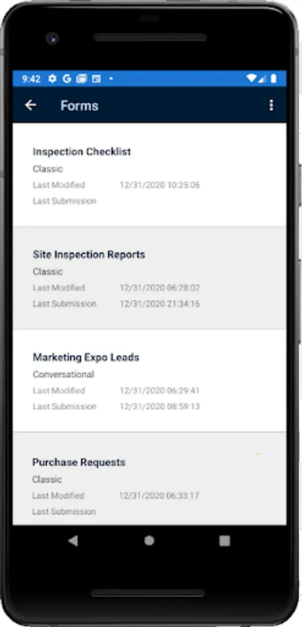 The forms themselves are built by you at www.globalpatron.com, then once you have built them, open the app and download them locally so you can collect data wherever you are, even without an internet connection. Then when internet is available again, the form submissions you have collected get pushed to the server.