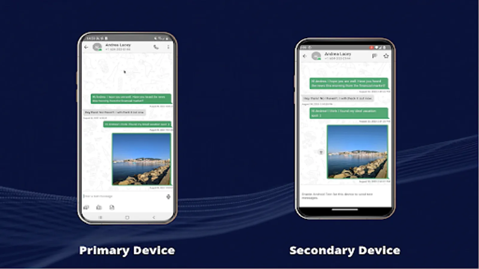 For Global Relay Android Text, data is synchronized across devices. (see video starts at 5:47) Once users declare a primary Android device, they explicitly authorize sending and receiving messages from it. After which, users can access their texts on other devices, e.g. a secondary Android device or desktop.