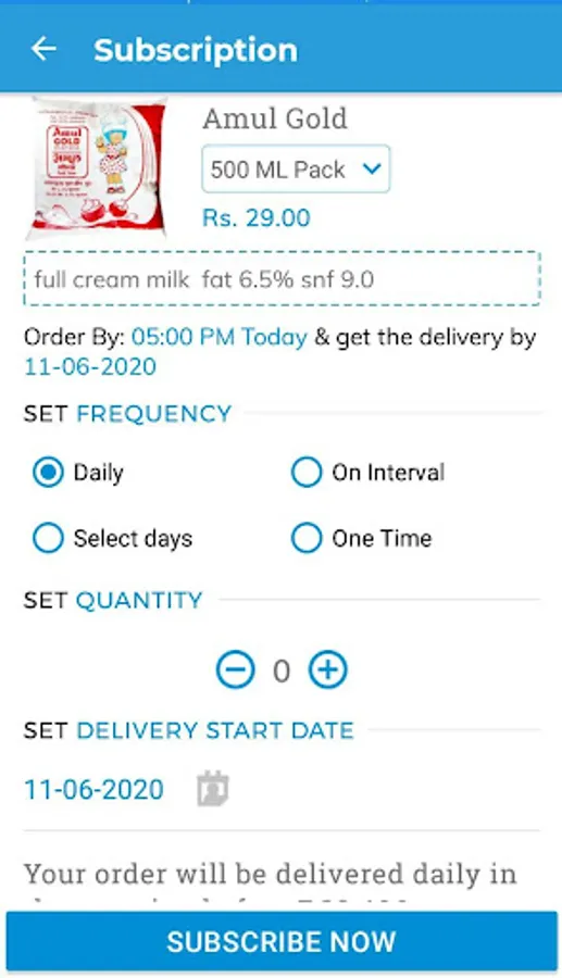 user can subscribe milk and other products on daily basis / alternate days / selected days. basis