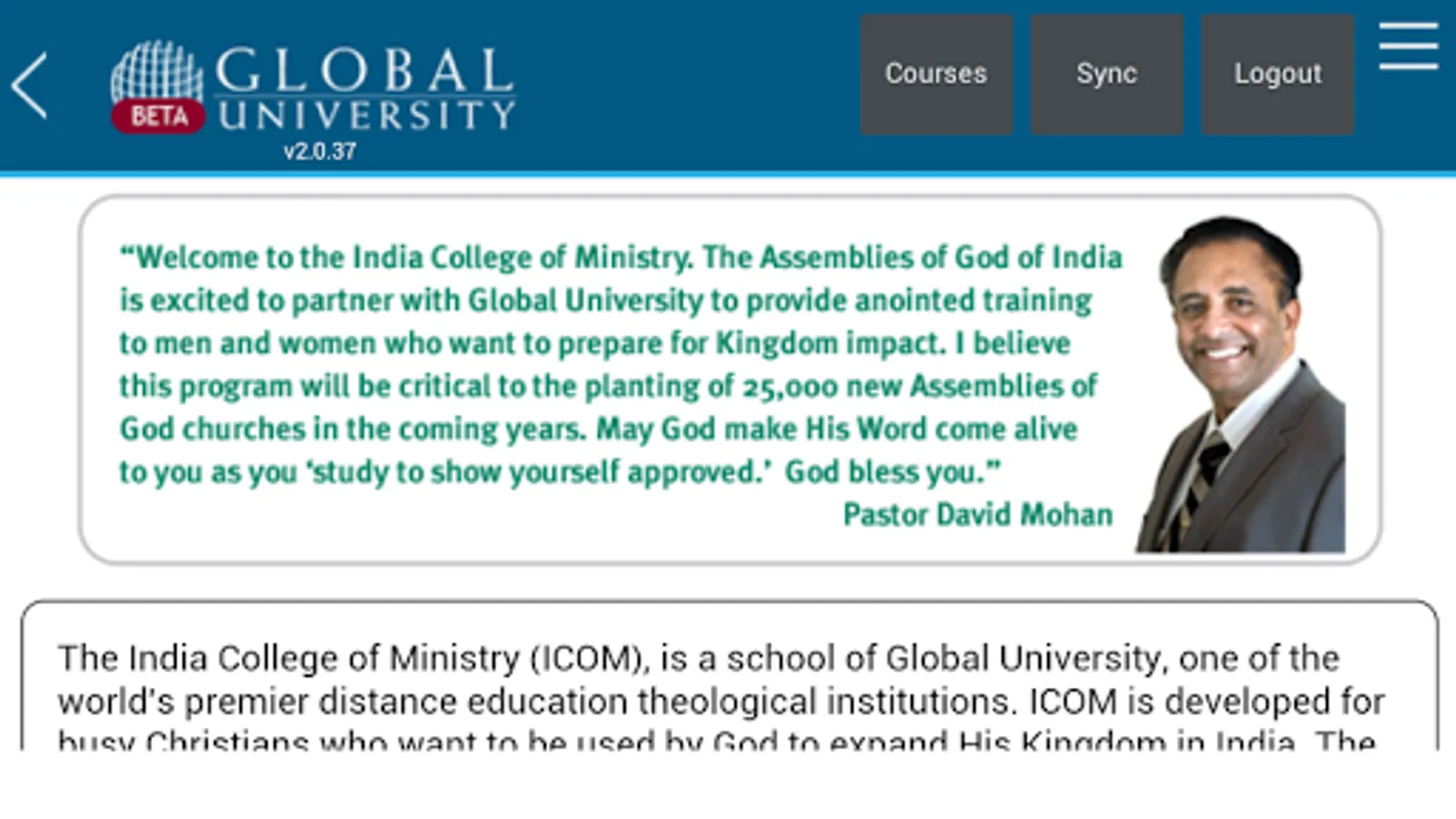The Global University Learning app fully integrates with the university’s learning management system and works on Android based phones and tablets. The app gives you access to course offerings, auto graded exams, supplemental resources, and more. This app is perfect for students on the go. All you need is just one initial internet connection for downloading course content and a subsequent connection after completing exam/s in order to upload scores to the GU student records database. This app is designed to work with courses offered through Global University’s School of Evangelism and Discipleship.