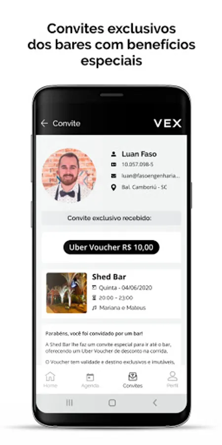 Vex subscribers can be selected by bars to receive invitations with exclusive benefits. You can receive a one-way Uber voucher to the bar, your favorite double drink, a free entry, a discount benefit on your account.