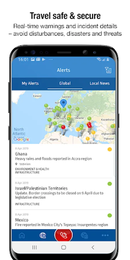 Receive push and SMS alerts to help you steer clear of trouble, such as extreme weather conditions and natural disasters, travel disruptions, political and civil unrest and terrorism threats.
