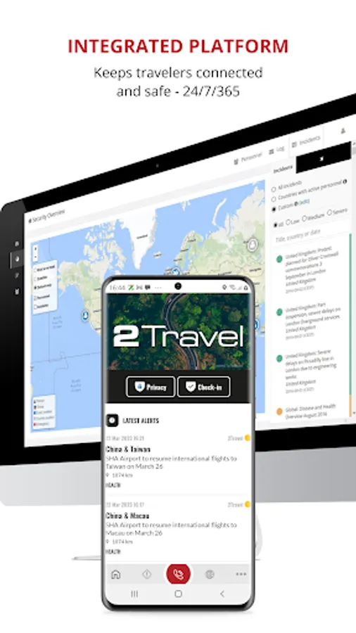 2Travel is a personal safety and early travel warning solution that provides real-time status on warnings, alerts, security information and travel plans. It integrates two security tools: the 2Travel app and the 2Travel Instant Security Overview (ISO) web portal.