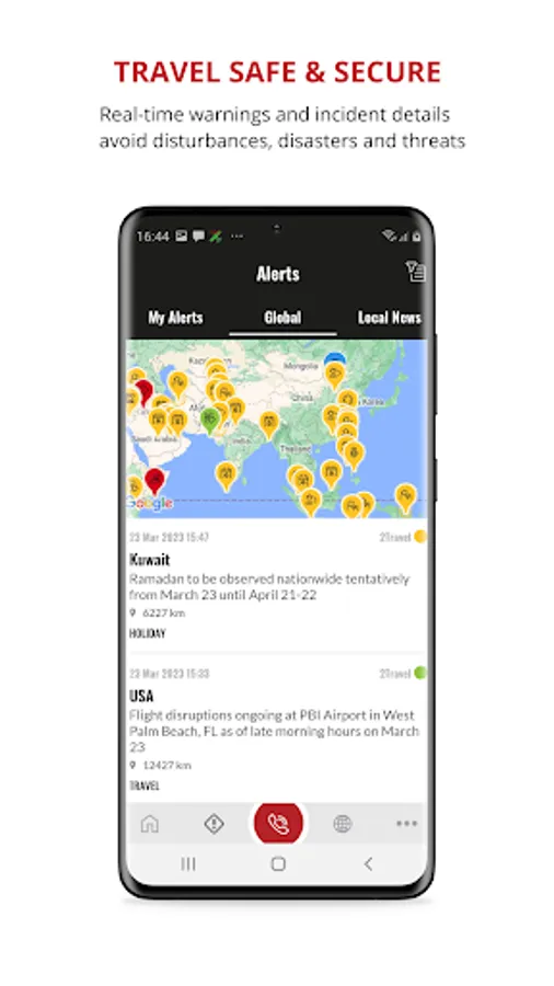 Receive push and SMS alerts to help you steer clear of trouble, such as extreme weather conditions and natural disasters, travel disruptions, political and civil unrest and terrorism threats.