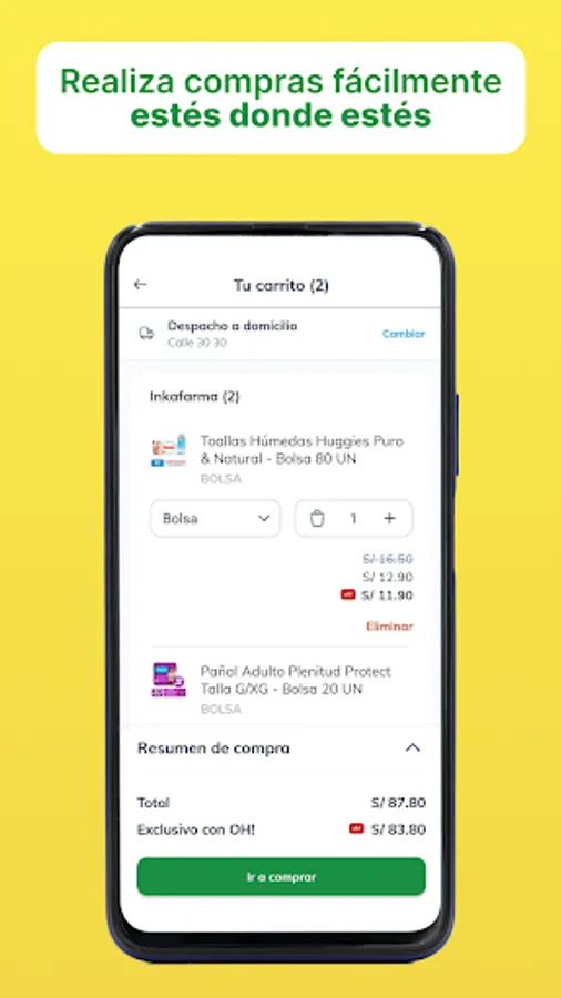 With Inkafarma Móvil you will no longer have to go to the pharmacy or drugstore to buy your medicines or personal care products, we have delivery available in various points of Lima, Arequipa, Trujillo and Chiclayo *.