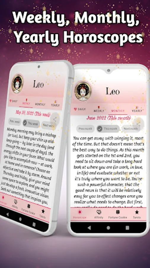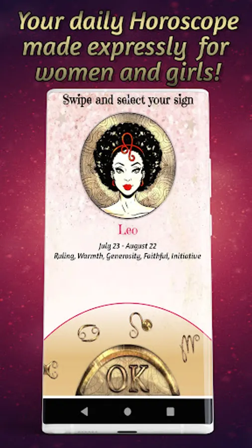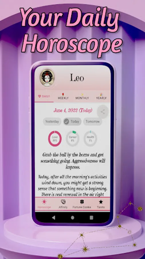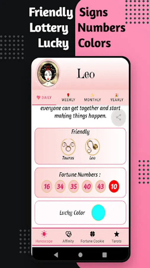 With She Horoscope, you can get your daily, weekly, and monthly horoscope with reliable predictions for all zodiac signs. You can also open a fortune cookie every day with a motivational phrase, receive daily lottery numbers, lucky colors, friendly signs, and discover free Tarot readings.