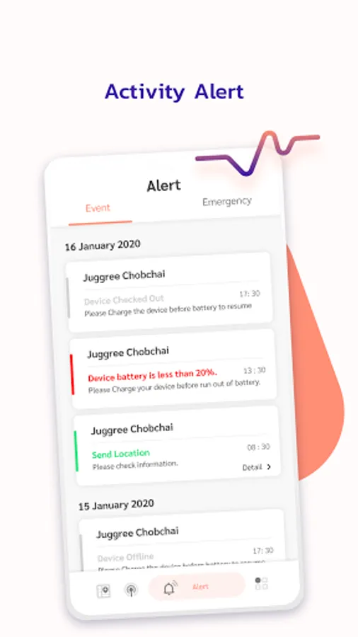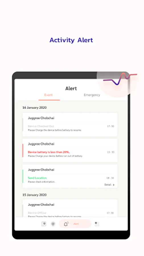 Supervisor can view a list of all incoming alerts from employees or team (i.e.when leaving the area) and receive Attendance Work Report notification