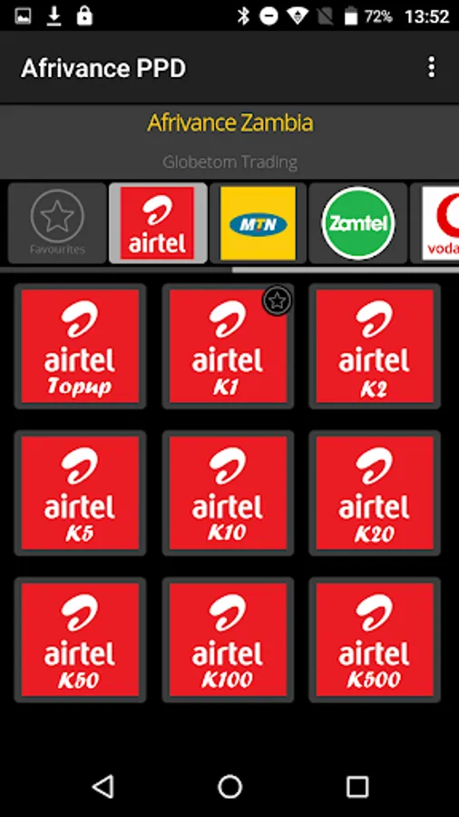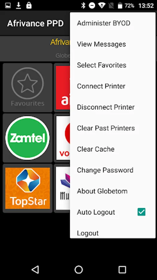Afrivance Prepaid Distribution POS application used by registered merchants and retail outlets to transact through the Globetom Revenue Weaver Cloud Platform and print vouchers using mini thermal bluetooth printers.