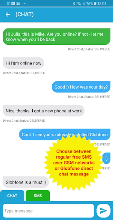 Globfone allows you to send text messages (SMS) to your friends and family anywhere in the world for FREE. Also, the receiver does not need to have the Globfone App installed on their phone. You can also send and receive Globfone direct chat messages on Globfone.