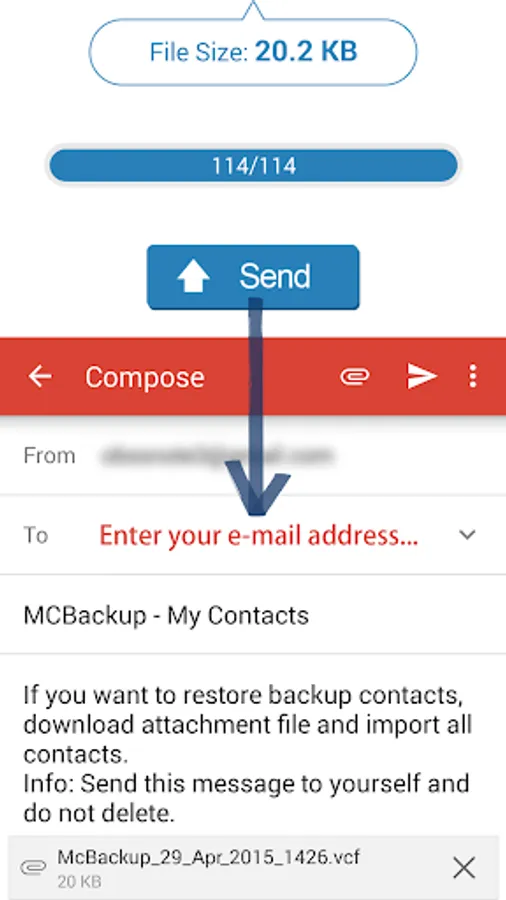 IMPORTANT NOTE: After sending backup file (*.vcf) to yourself, please check your inbox if message arrived and contains attachment (backup file). Sometimes email providers block attachments if attachment size is too large. Try with another mail account if possible, to send your backup file. Or copy backup file (on SD card) to your computer via USB cable.