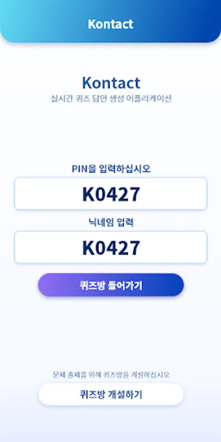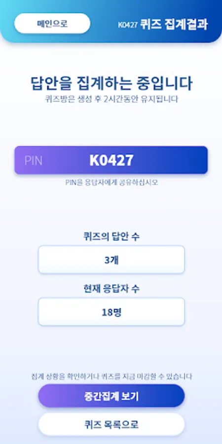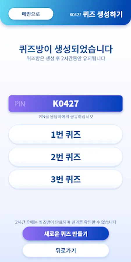 2. When opened, a quiz room is automatically created and a PIN is assigned. Share this PIN with respondents. The PIN is not replaced and the quiz room itself only lasts for 2 hours. The quiz room automatically expires after 2 hours.