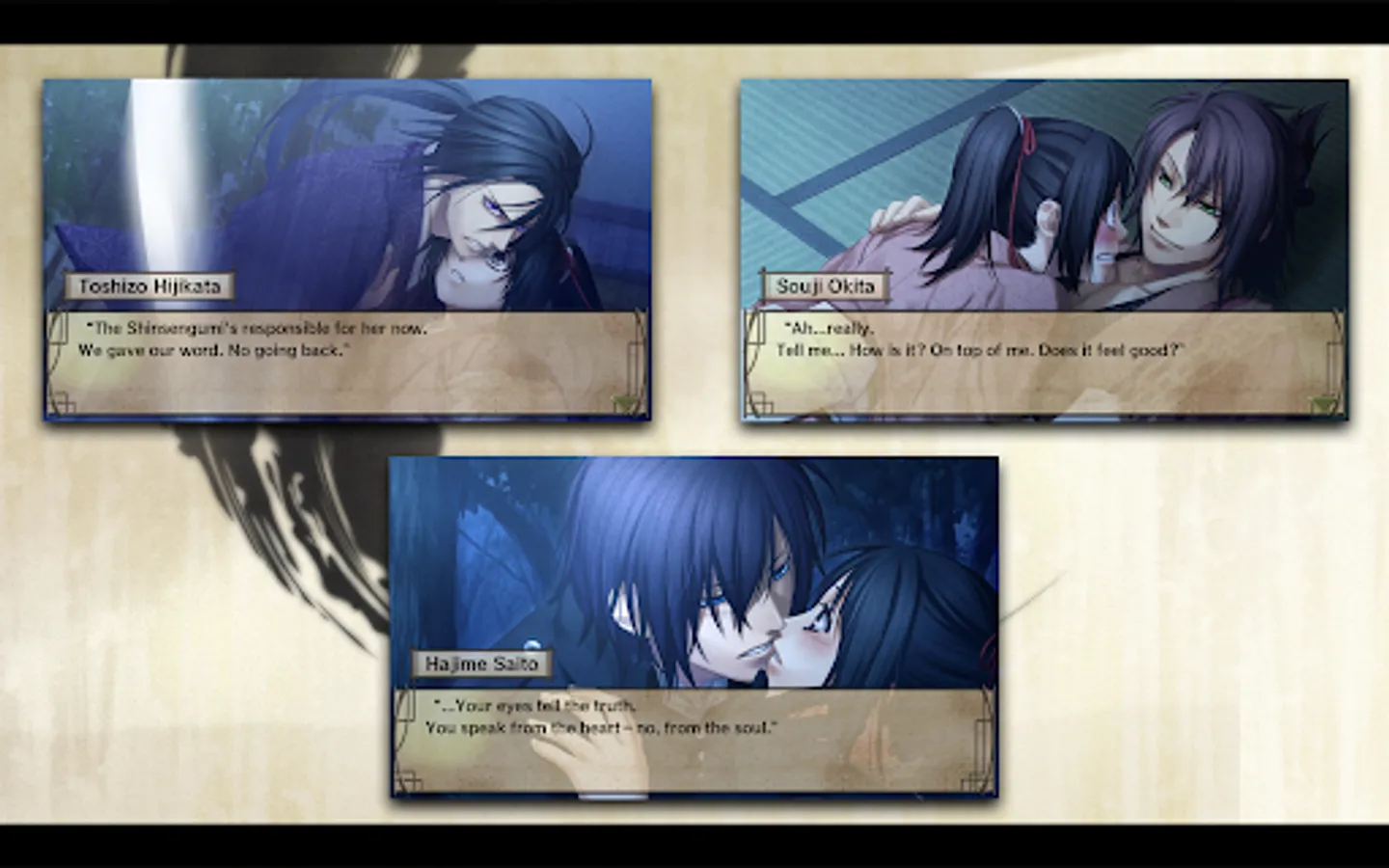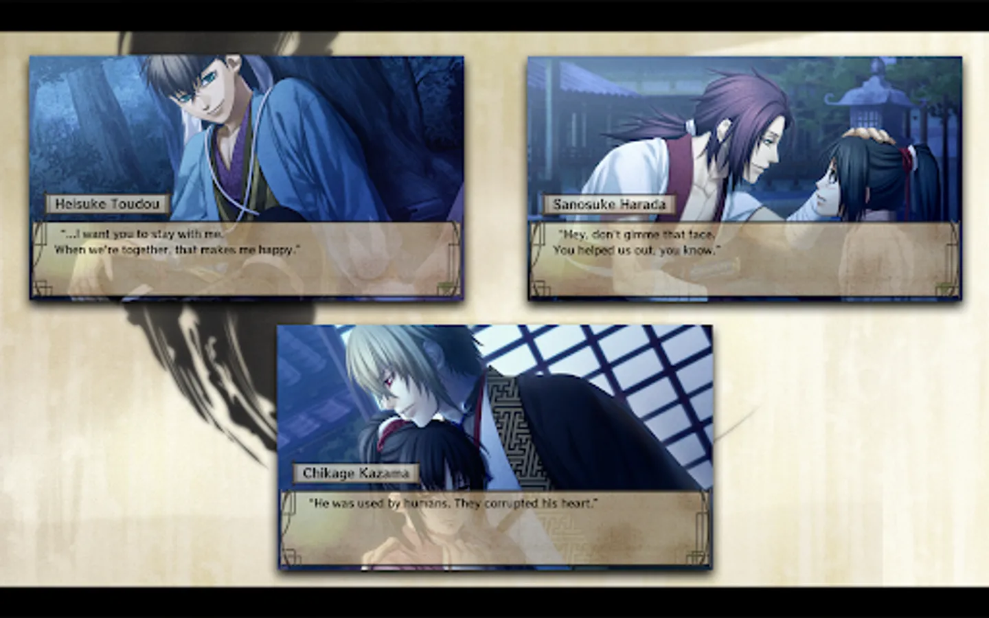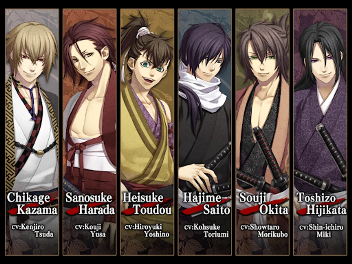 Toshizo Hijikata(CV:Shin-ichiro Miki)/Souji Okita(CV:Showtaro Morikubo)/Hajime Saito(CV:Kohsuke Toriumi)/Heisuke Toudou(CV:Hiroyuki Yoshino)/Sanosuke Harada(CV:Kouji Yusa)/Isami Kondou(CV:Toru Okawa)/Keisuke Sanan(CV:Nobuo Tobita)/Shinpachi Nagakura(CV:Tomohiro Tsuboi)/Kodo Yukimura(CV:Ryugo Saito)/Chikage Kazama(CV:Kenjiro Tsuda)/etc