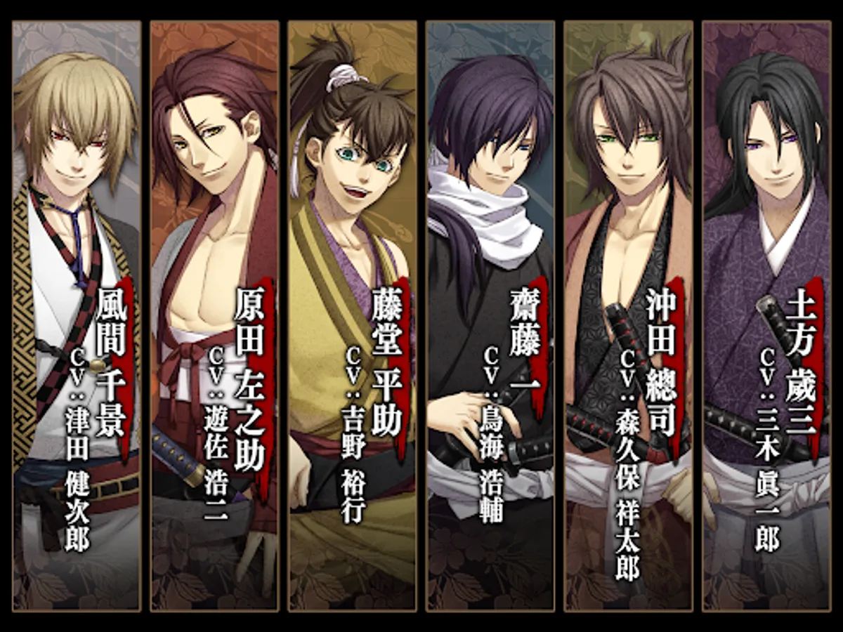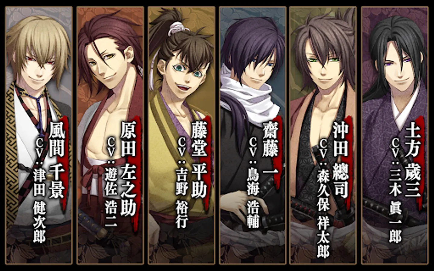 Hijikata Toshizo (CV: Shinichiro Miki) / Okita Chief Director (CV: Shotaro Morikubo) / Saito Kazu (CV: Kosuke Torimi) / Fujido Hiroyuki (CV: Yoshino Hiroyuki) / Harada Satosuke (CV: Yusa Koji)