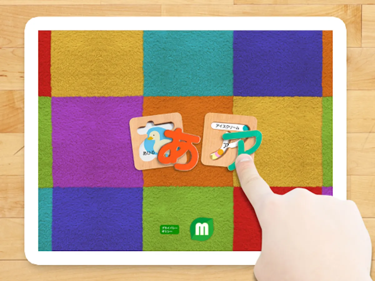The background of the wooden frame shows an illustration of an object beginning with the letter of the Hiragana and Katakana being displayed, so that children can think about the object straight away. As they touch and insert pieces in the frame, they will hear a native speaker say the words out loud. This allows them to listen to Japanese words with the correct pronunciation. By repeatedly touching the screen, they can play and learn spontaneously about the shapes of the letters and their pronunciation.