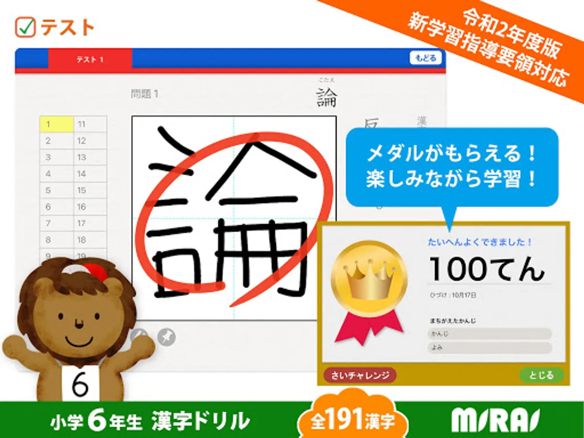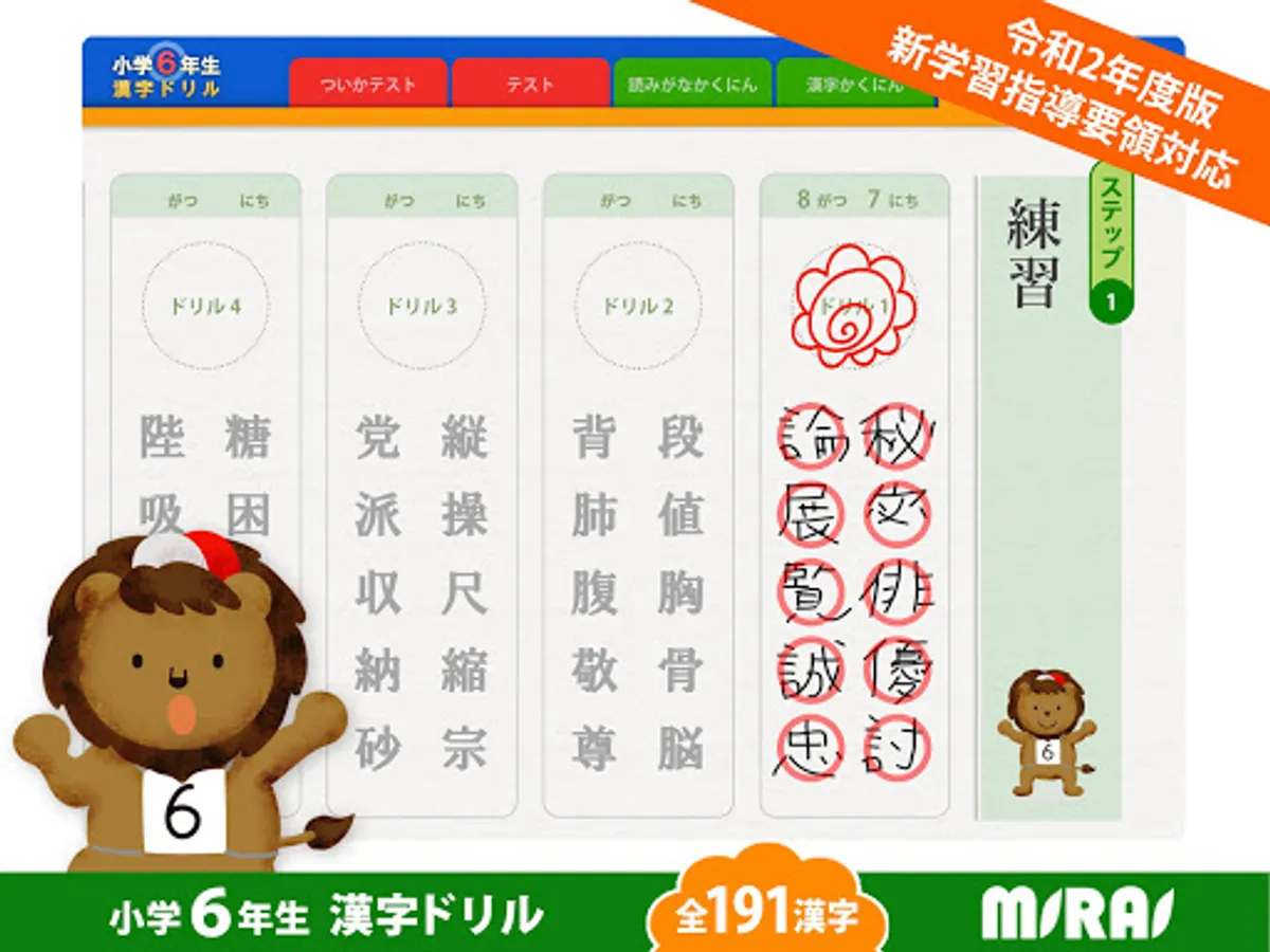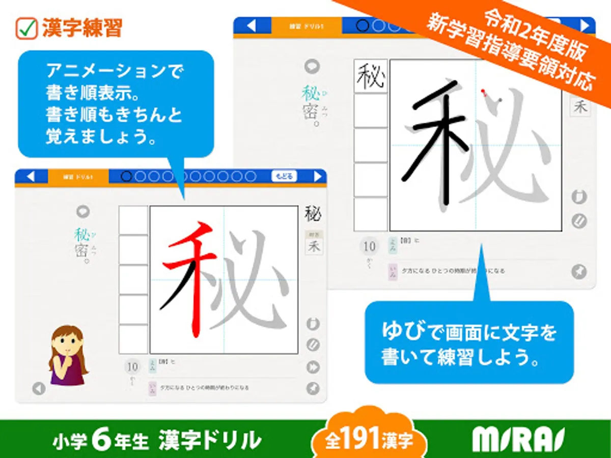 The "Reiwa 6th grade Kanji drill" covers 191 kanji learned in the 6th grade elementary school language in accordance with the 2020 revised elementary school curriculum guidelines. With this app, you will surely acquire reading and writing skills by seeing kanji with your eyes, listening to the words with your ears, and actually writing with your fingers. By learning the correct stroke order, you can practice writing beautiful letters.